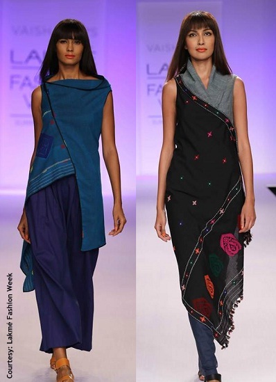 The first day of Lakmé Fashion Week Summer/Resort 2014 witnessed a beautiful mix of contemporary cuts and Indian ethnic silhouettes. After Manish Malhotra’s grand opening as an off-site show, amidst the glamor and glitz of Bollywood divas, the first day of the fashion event began with the GenNext Show. The first show presented a group of six enthusiast and creative designers – Ujjawal Dubey, Vilvin Sabu, Chandni Mohan, Divya Seth, Parun Bhargava and Shreejith Jeevan who enthralled the spectators with their out-of-the-box designs. We loved Divya Sheth’s collection that showcased a blend of the East and the West. Unconventional silhouettes accentuated with Indian textiles brought a fresh twist. A blend of khadi, Ikat, Jamdani weaves with accents of fine Indian embroidery injected a touch of Indian-ness to her collection. On the other hand, Sougat Paul’s showcase of color blocked pre-stitched saris and interesting play of digital prints, floral motifs and beaded embellishments was reminiscent of the old world charm.